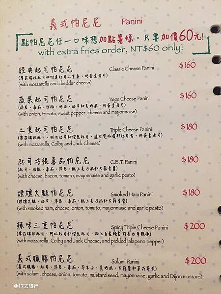 😂,小小的店面,假日早午餐的時間坐的滿滿的,等餐時間並沒有太久,17點墨西哥帕尼尼加上80元的套餐(沙拉+飲料),拉開帕尼尼的那一霎那,真是太滿足了